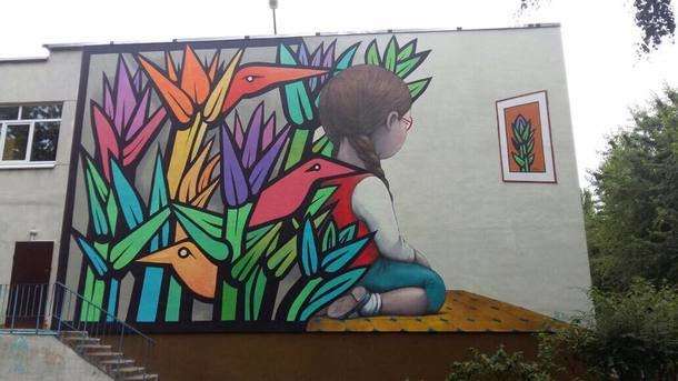 Среди необычных – мурал с девочкой, которая рассматривает рисунок, а за ней – ее воображение: то, что она видит и чувствует. Эту работу можно увидеть на одной из торцевых стенок школы №274 (Харьковское шоссе, 168-и, напротив детской поликлиники).