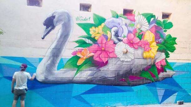 В этом же районе на здании теплопункта художник изобразил симпатичного белого лебедя с яркими цветами.