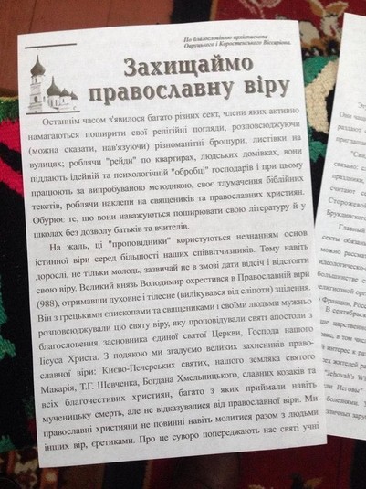 «Среди прочего в течение двух суток изъято 75 экземпляров брошюры «Украинская православная церковь: Отношения с государством. Отношение к АТО и церковному расколу. Вопросы и ответы», которая уже попадала в поле зрения СБУ, и на которую уже есть соответствующее заключение эксперта», - заявили в СБУ.