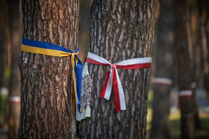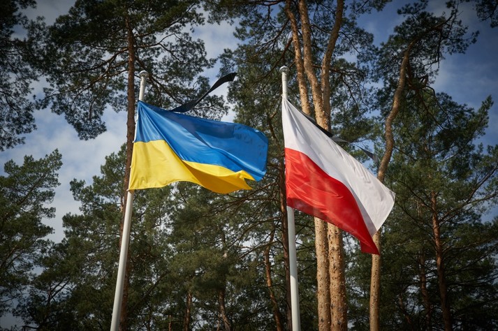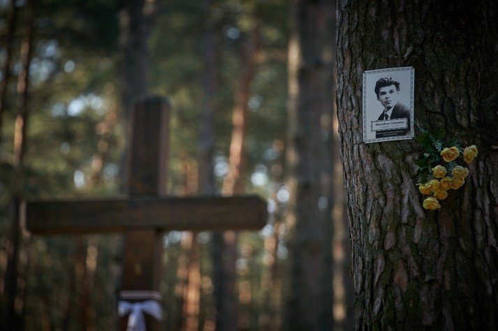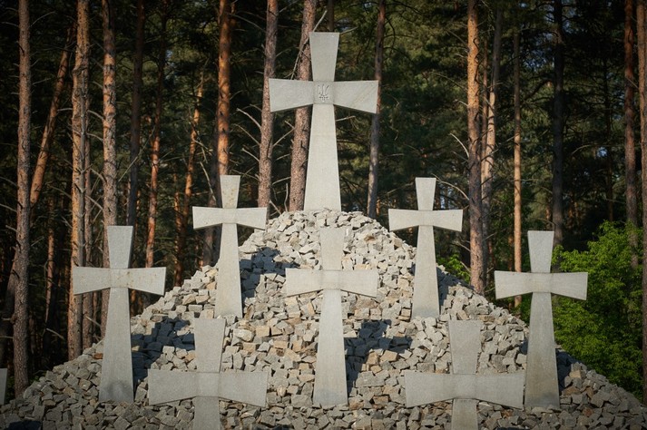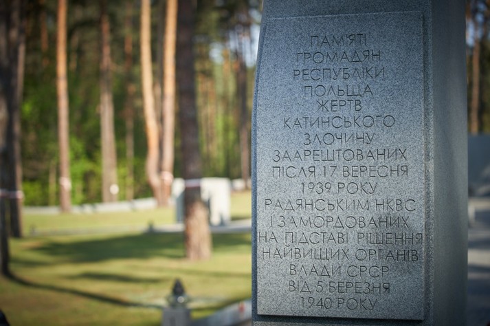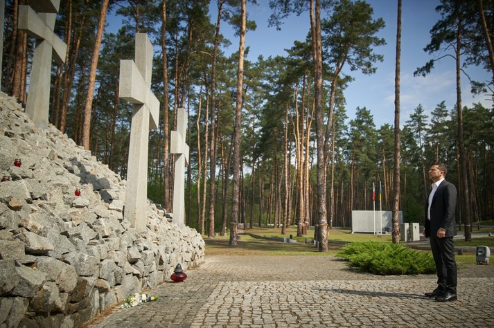 Зеленский возложил цветы к братской могиле у центрального монумента мемориала «Быковнянские могилы» и к памятному знаку польских захоронений.