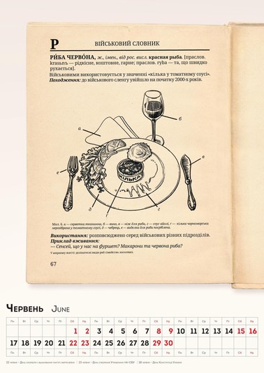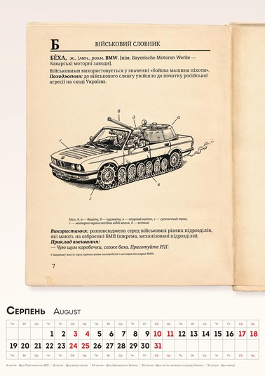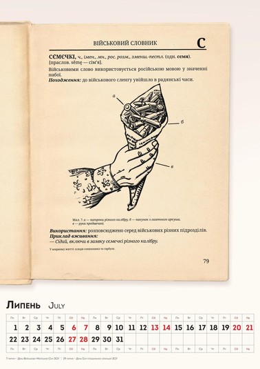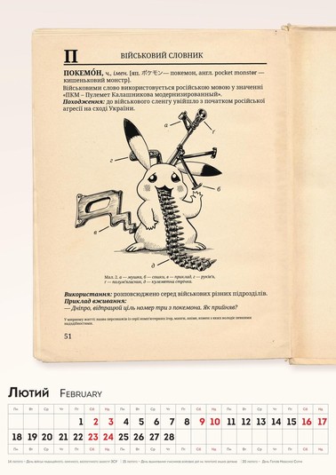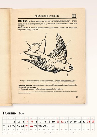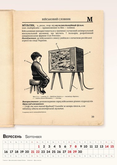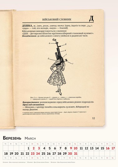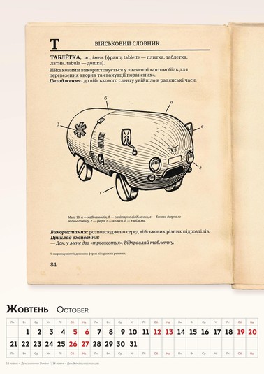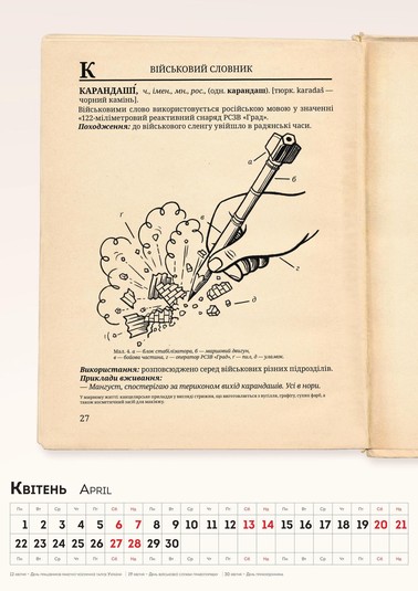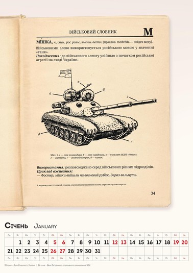 Календарь показывает феномен военных неологизмов и влияние войны на язык. «Покемон», «дашка», «мишка», «птичка», «таблетка» — далеко не полный список неологизмов военного языка. Все иллюстрации к «Словарю» выполнены Александром Комяховым, который объединил первоначальный и военный смысл в своих рисунках. Стилистика иллюстраций напоминает советские учебники по допризывной подготовке.