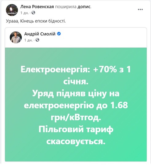 Кабинет министров отменил с 1 января 2021 года льготный тариф 90 коп./КВт.ч на первые 100 кВт для бытовых потребителей. Отныне весь объем потребленной электроэнергии бытовые потребители будут оплачивать по единому тарифу – 1,68 грн/кВт.ч, тариф будет действовать до 31 марта.