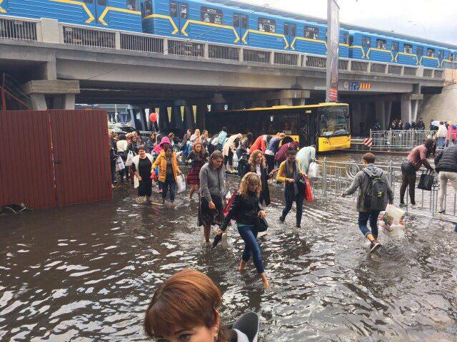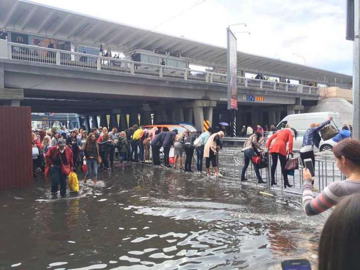 В Киеве в среду, 20 сентября, в результате сильного ливня масштабно затопило территорию возле станции метро «Левобережная», где недавно проводили капитальный ремонт к «Евровидению».