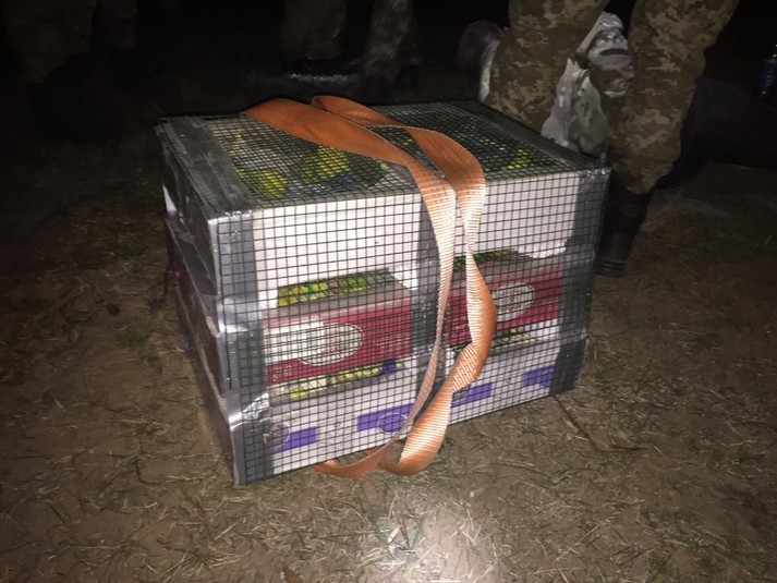 Пограничники проверили прилегающую территорию, где был задержан нарушитель - был обнаружен большой ящик, оборудованный ремнями для удобства переноски, в котором находилось 150 попугаев.