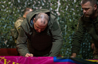 В командном пункте 92-го отдельного штурмового бригады имени кошевого атамана Ивана Сирко командир бригады полковник Павел Федосенко отчитывался о ситуации на линии боевого столкновения в зоне ответственности подразделения, а военнослужащие бригады подарили Умерову стилизованный флаг бригады.
