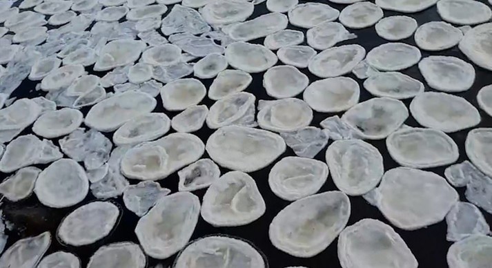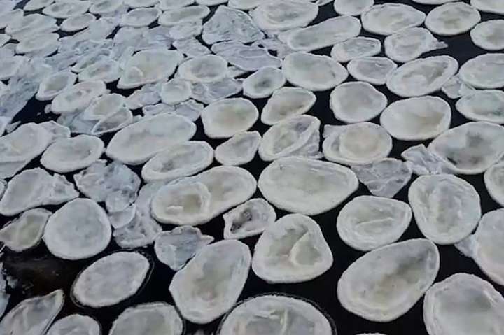 Десятки «ледяных блинов» разных размеров плыли по поверхности реки. Диски размером от 20 до 200 см образовались из-за трения кусочков льда друг об друга.