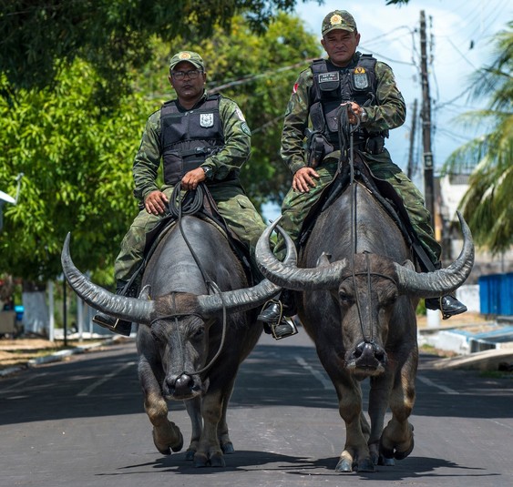 В Бразилии полицейские патрулируют улицы верхом на огромных буйволах