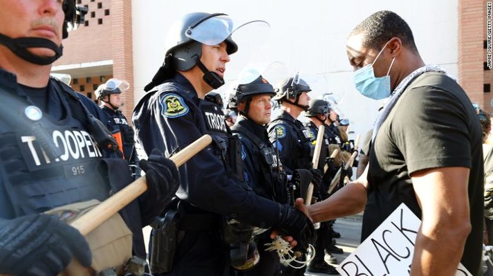 В США полицейские начали присоединяться к протестующим в знак солидарности. Об этом идет речь в материале американской медиакомпании CNN.