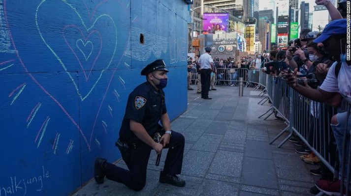 В Нью-Йорке был замечен полицейский, который также встал на колено перед митингующими во время протеста на Таймс-сквер в воскресенье.