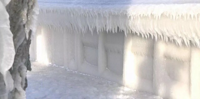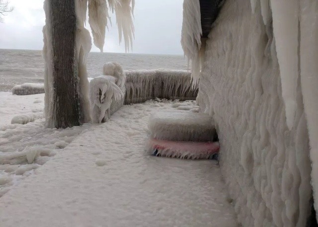 Этот пляжный домик находится на побережье озера Онтарио в Пуласки, штат Нью-Йорк, и всего за несколько дней он оказался практически полностью погребен под толстым слоем льда.