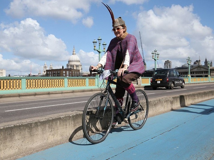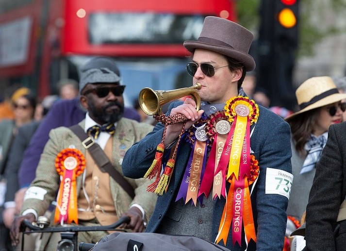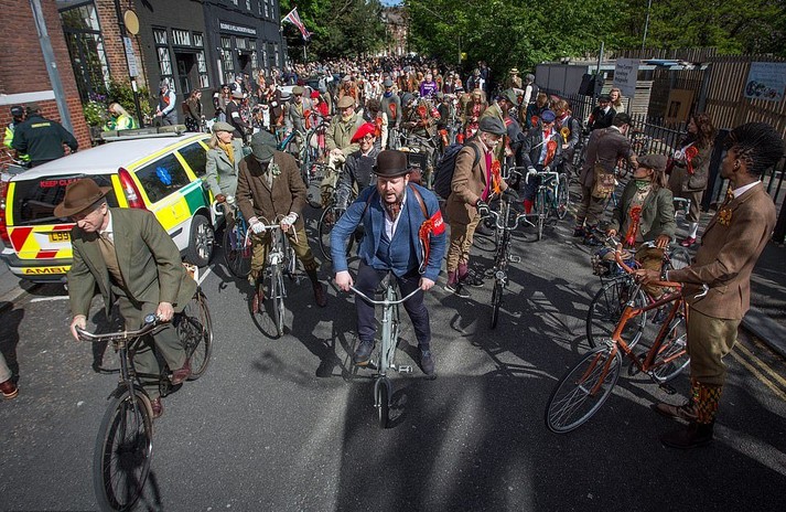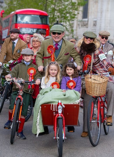 Велосипедисты в винтажных нарядах, многие на ретро велосипедах, преодолели 12-мильный маршрут из Клеркенуэлла в Южный Кенсингтон мимо здания Парламента, Музея естественной истории и Букингемского дворца.
