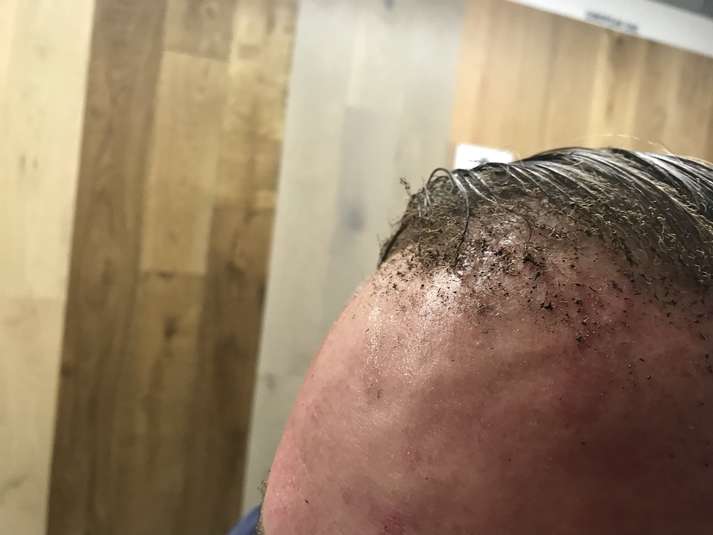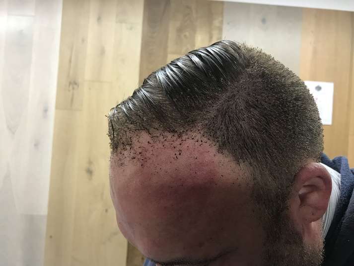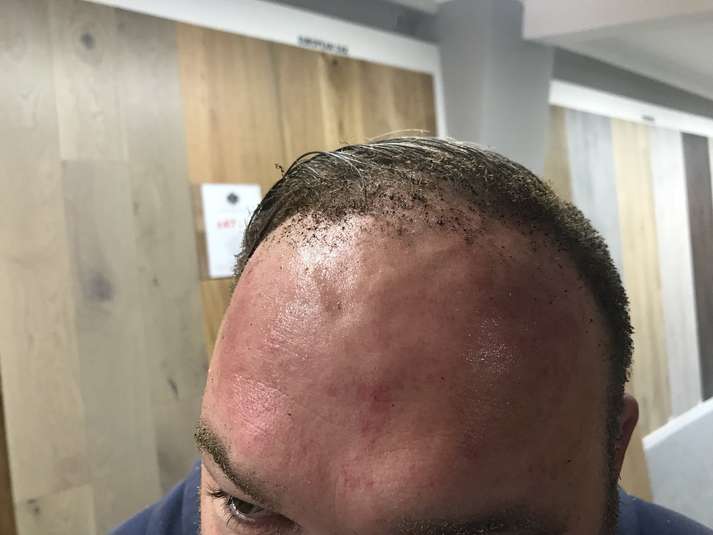 Как видно на снимках, у пострадавшего травмирован лоб, часть волос обгорели.