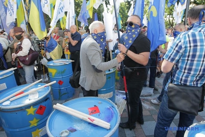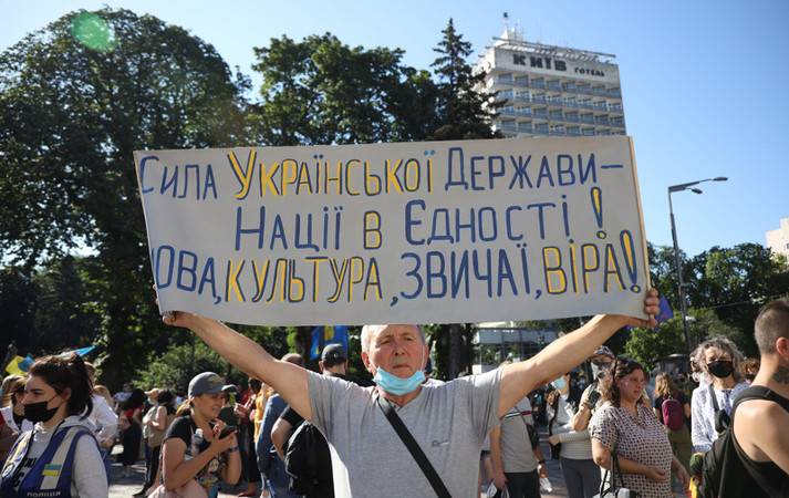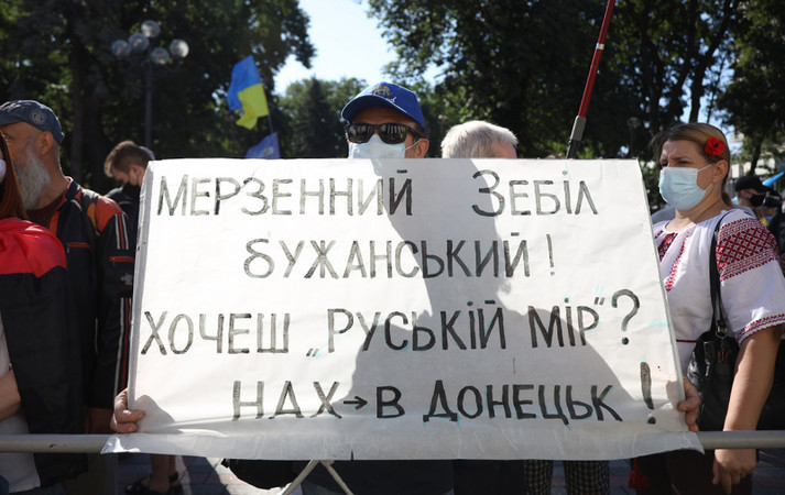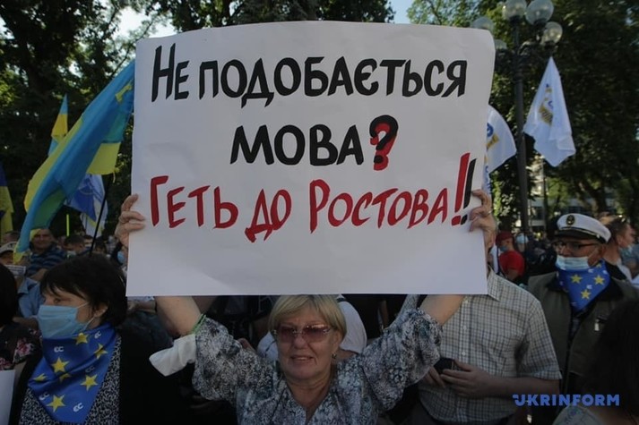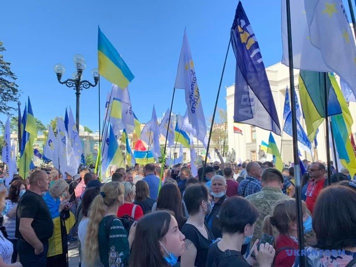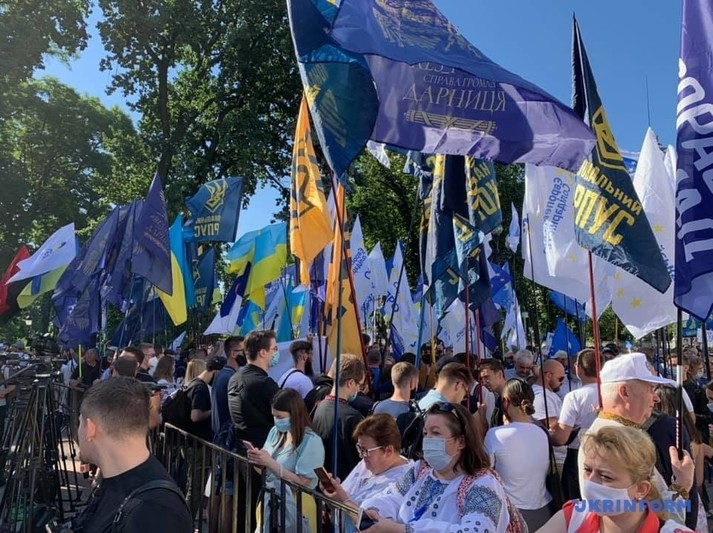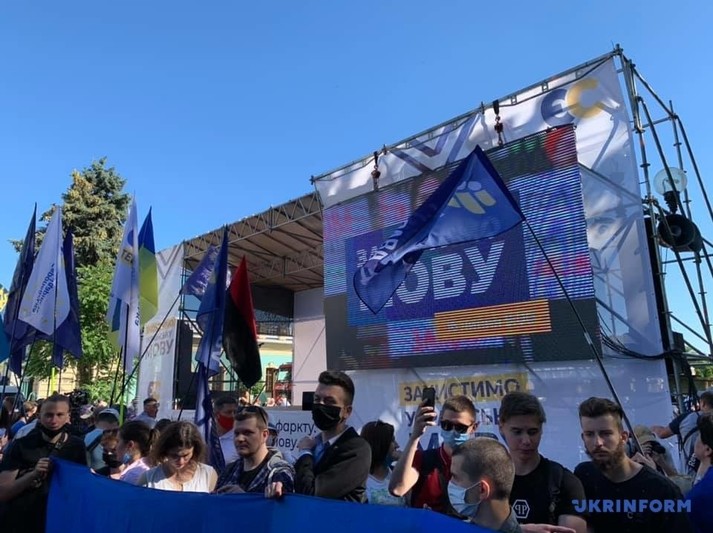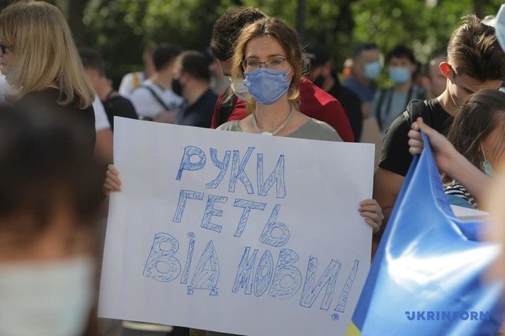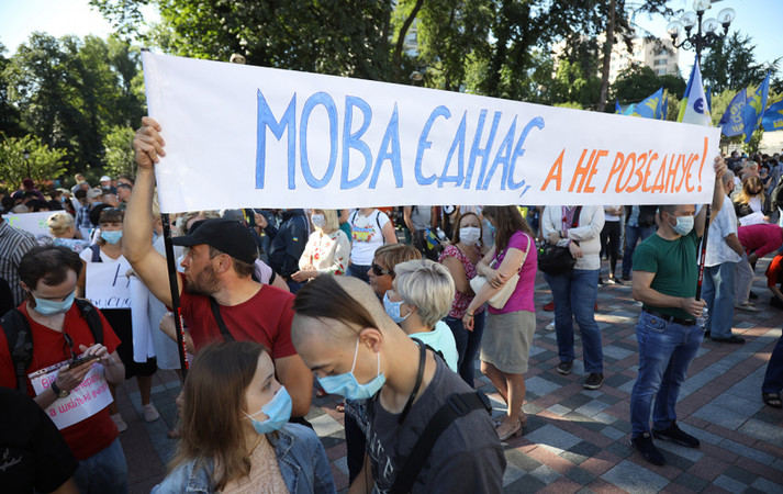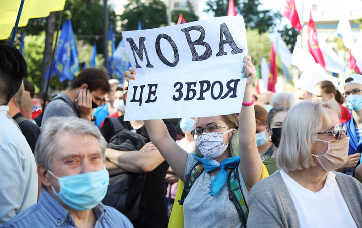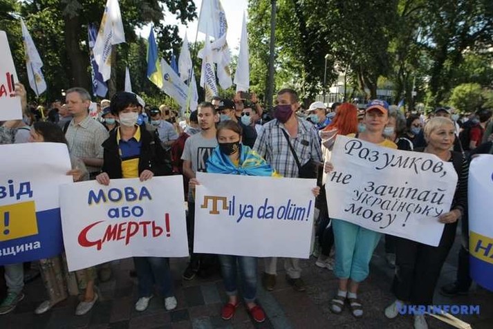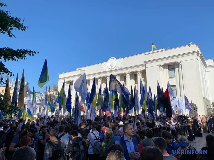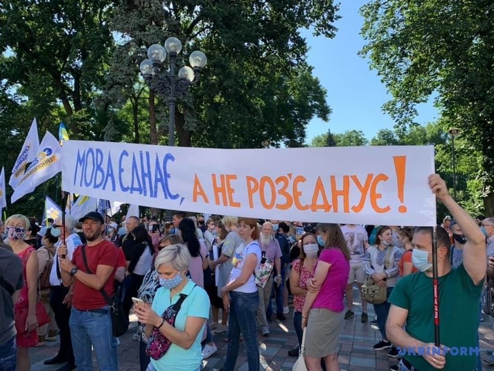 Возле Верховной Рады около сотни людей устроили митинг против законопроекта, инициированного депутатом от «Слуги народа» Максимом Бужанским. Законопроект касается использования украинского языка во время обучения в школах.