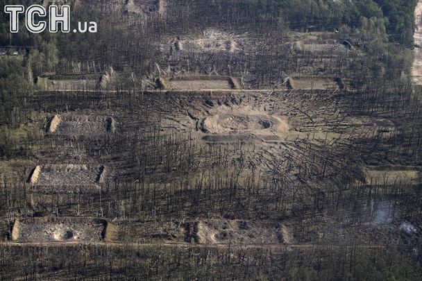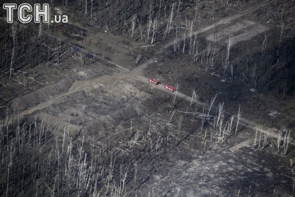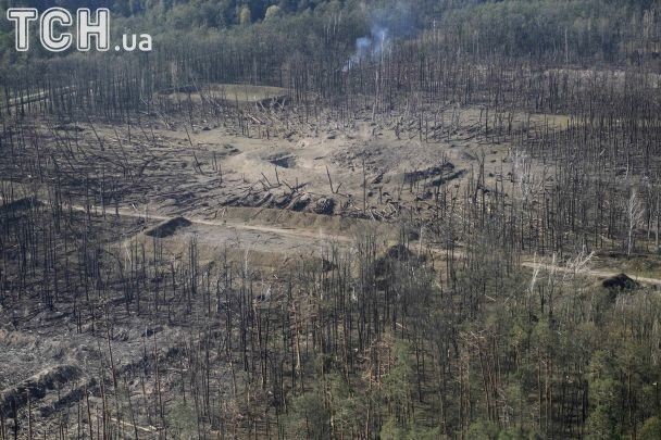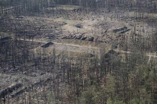 Территория складов, как видно на фото, полностью выгорела. Стволы деревьев стоят почерневшие от огня.