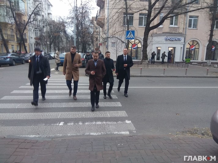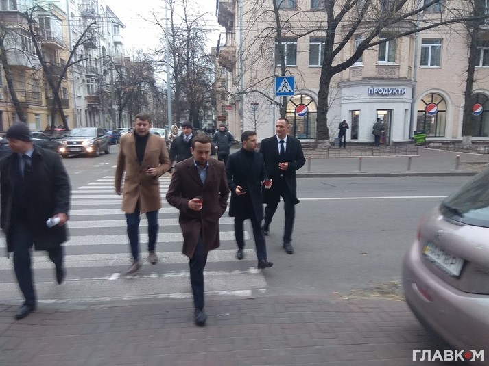 Группу людей вместе с главой государства корреспондент «Главкома» заметил на улице Шелковичной – глава государства вместе со спутниками направлялись на Банковую.