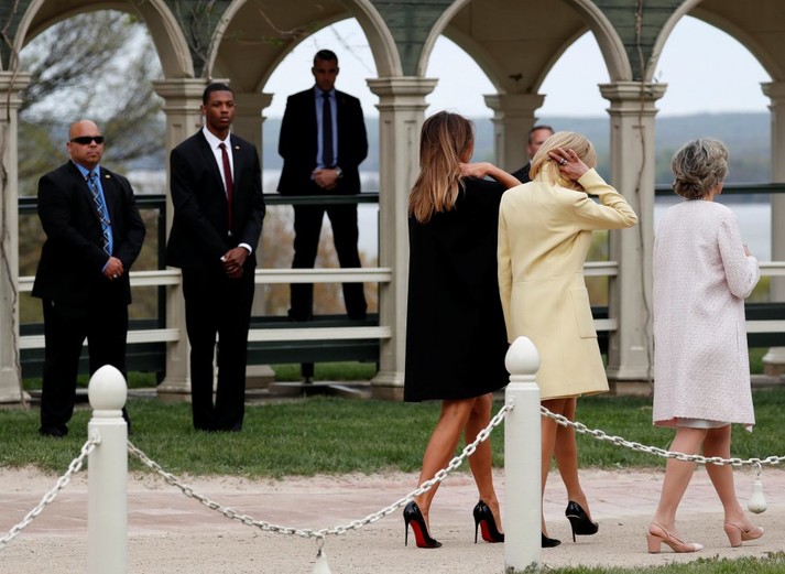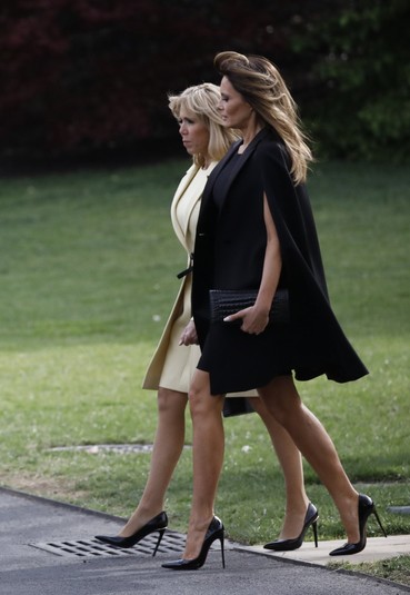 Для приема в Белом доме 65-летняя Брижит выбрала пальто светло-желтого цвета с черной отделкой, а также платье в тон от своего любимого бренда Louis Vuitton. А 47-летняя миссис Трамп облачилась в черное — накидку-смокинг от французского дома Givenchy (стоимостью 2790 долларов), платье от Dolce & Gabbana и туфли Christian Louboutin.
