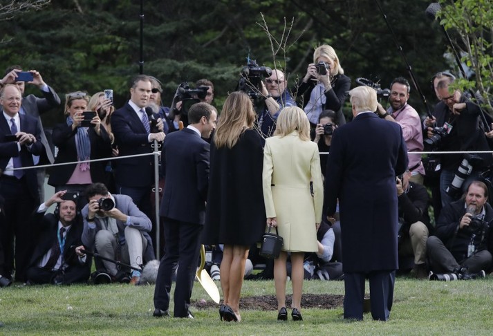 Между тем Дональд Трамп и Эммануэль Маркон вместе посадили на южной лужайке Белого дома саженец дуба, который чета Макрон привезла в подарок из Франции.