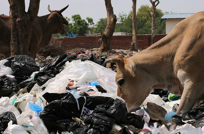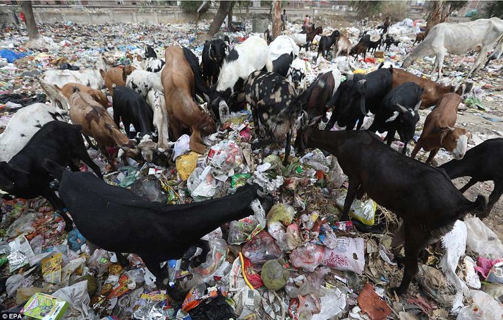 Бродячие собаки, козы и коровы жуют пластиковые отходы, дети также играют на кучах мусора.