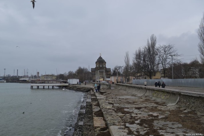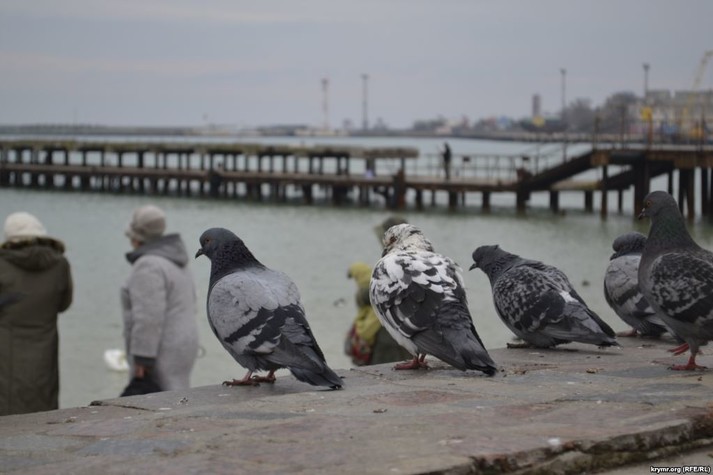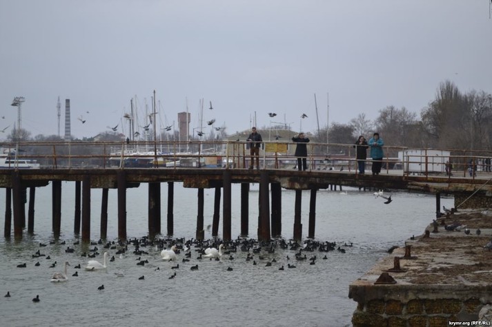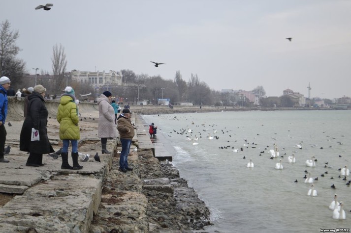 Зимой евпаторийская набережная пустует. Местные жители подкармливают птиц, оставшихся на зиму, а ларьки с сувенирами не пользуются большой популярностью.