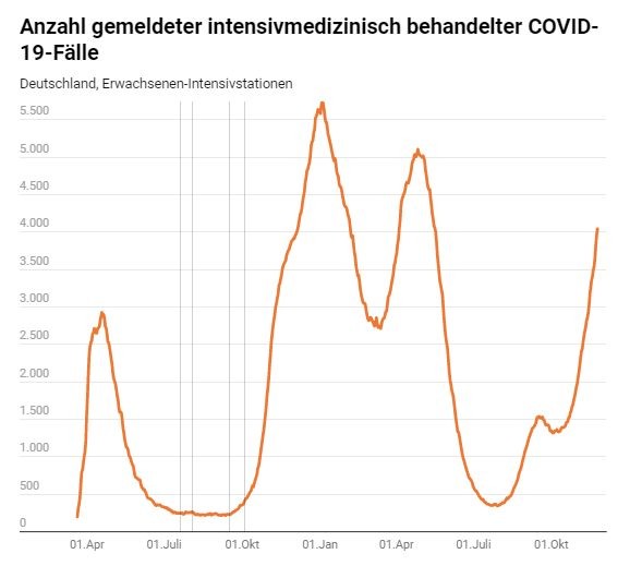 А что-бы антиваксы сильно не расправляли крылья, вот больничная статистка по Германии. Данные по общему кол-ву пациентов в больницах нет. Есть данные только по числу пациентов в отделении интенсивной терапии. На сегодня 4038 пациентов в интенсивной терапии на 80-миллионную страну где за день более 70 тыс новых случаев.