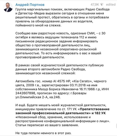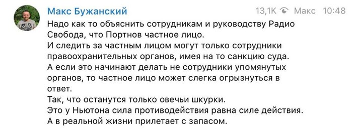 Причем, нынешний случай примечателен тем, что журналистам «Схем» ранее открыто угрожал в своем телеграм-канале Андрей Портнов, который публиковал данные сожженного автомобиля и его водителя Бориса Мазура. А народный депутат из фракции «Слуга народа» Максим Бужанский к этим угрозам присоединялся и писал, что от журналистов «останутся только овечьи шкурки» и намекал, что им «прилетит с запасом».