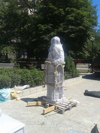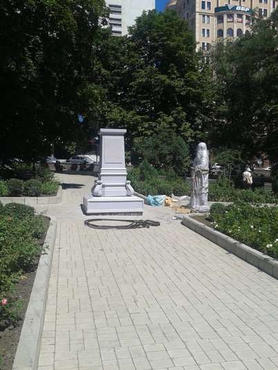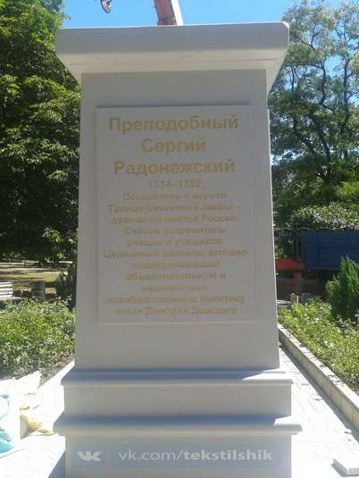 В центре Донецка, в сквере возле храма, установили памятник Сергию Радонежскому. В самом памятнике ничего примечательного нет. Обычная каменная скульптура. А вот надписи на постаменте очень любопытны.