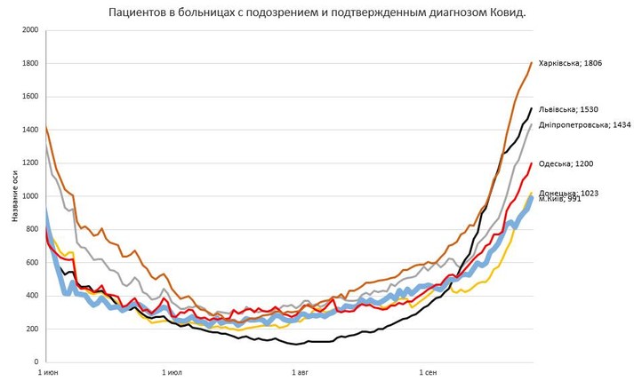 Посмотрите, в середине июля практически все регионы были на одном уровне. Первым стартовала Харьковская область (близость с россией). Затем пошел рост в Днепропетровской области (для меня загадка, но наверно из-за крупных пром предприятий). Потом Львовская область неожиданно взлетела.