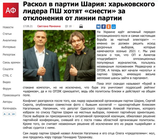 Обиженный Никита пошел жаловаться на вождя в СМИ. А поскольку сам Шарий со своей манией величия давно уже перессорился со всеми, с кем только мог, то скандальные откровения Роженко подхватили даже вчерашние единомышленники Шария с «ватного» фланга. Включая сайт «Страна», связанный с Левочкиным из ОПЗЖ.