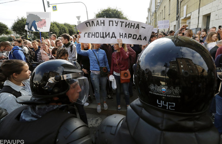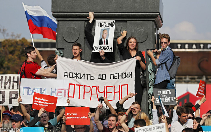 В минувшее воскресенье, 9 сентября, в единый день так называемых выборов в России, когда голосовали за губернаторов, мэров и депутатов, в нескольких десятках российских городов прошли протесты против пенсионной реформы. Силовики задержали более тысячи участников акций. Однако же лозунги протестующих были не только и не столько об этой реформе: звучало и было написано «Долой царя», «Путин, когда на пенсию?», «Путин — вор».