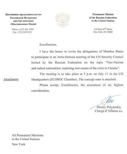 Есть такая известная цитата, что «фашисты будущего будут называть себя антифашистами. И это самое точное тому, что сейчас происходит в России. Добрые люди передали мне документ, который свидетельствует о том, что Россия, в лице туповатого и придурковатого зама постоянного представителя РФ при ООН, Дмитрия Полянского, созывает заседание в Совбезе ООН на тему «Неонацизм и радикальный национализм: изучение первопричин кризиса в Украине». Заседание назначено на 11 июля. И это трэш.