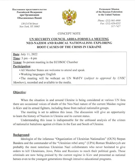 «Когда ситуация в Украине и вокруг нее рассматривается на различных форумах ООН, то время от времени раздаются голоса сомнения в неонацистской природе нынешнего режима Майдана в Киеве и его вооруженных боевиков, в том числе из радикальных националистических группировок. На заседании будет рассмотрен этот вопрос. Дискуссия даст возможность узнать историю нацизма в Украине и его современное состояние. Понимание этого вопроса необходимо для непредвзятого анализа преступлений националистической банды.»