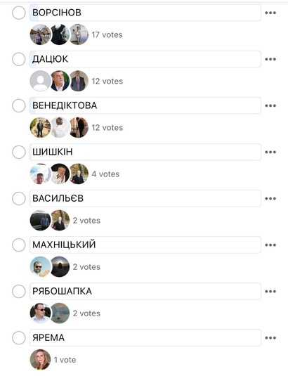 Закрытая фейсбук-группа прокуроров Украины. Больше 10 000 прокурорских работников, как бывших, так и сегодняшних. У них сейчас идет голосование за того, кто был лучшим Генпрокурором Украины за последние 30 лет.