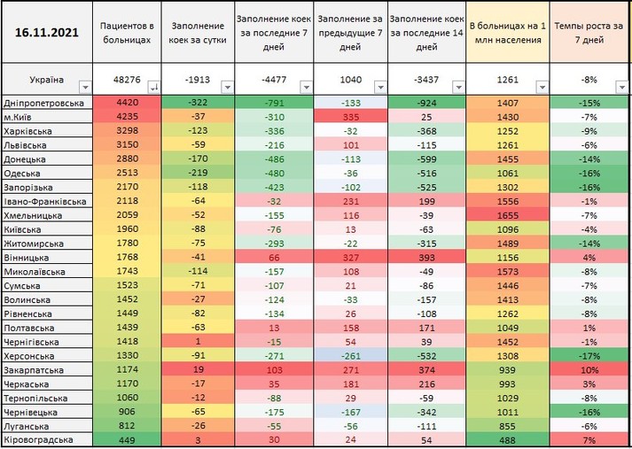 За прошедшие сутки освободилось 1913 койкомест по Украине.