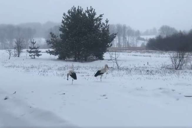 Люди угостили едой двух аистов, которых нашли на заснеженном поле