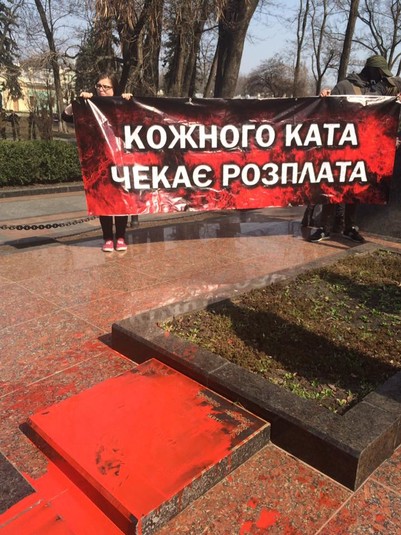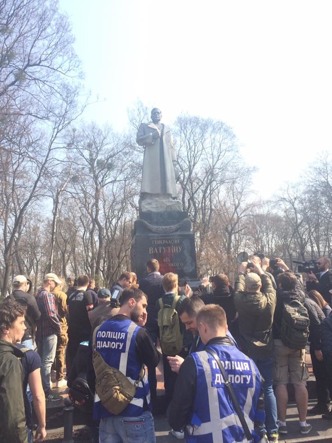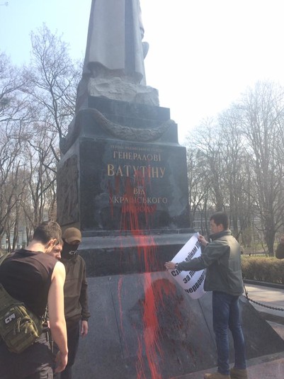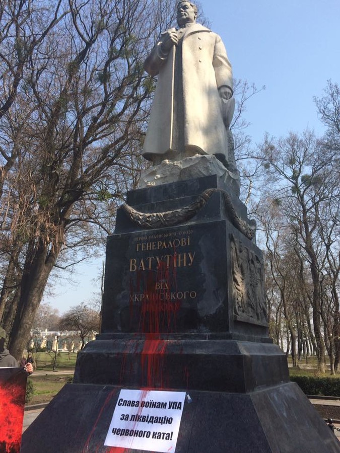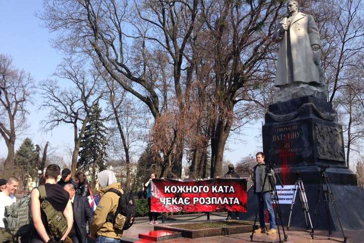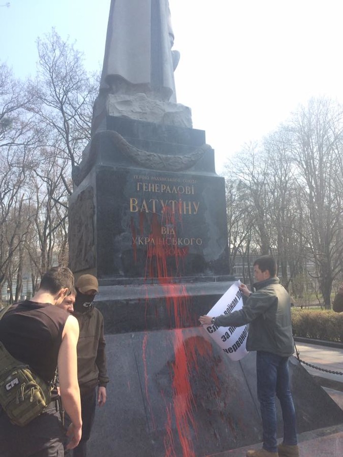 Активисты облили памятник Ватутину красной краской и развесили транспарант с надписью «Каждого палача ждет расплата». Кроме того, они вступили в спор со старшими людьми, пришедшими к памятнику с цветами, и выкрикивали, что настоящими героями являются Шухевич и воины УПА.