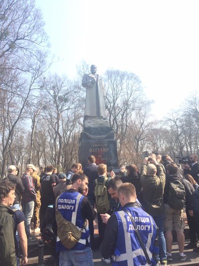 В Киеве в пятницу, 13 апреля, возле памятника Ватутину в Мариинском парке произошла потасовка между активистами националистической организации C14 и людьми, которые пришли возложить цветы к монументу в годовщину смерти советского военачальника.