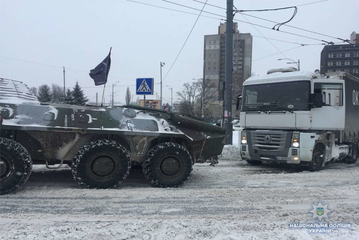 В Киеве в четверг, 1 марта, полицейские с помощью военной спецтехники помогают водителям выбраться из снежных ловушек.