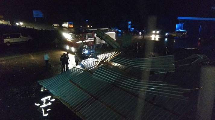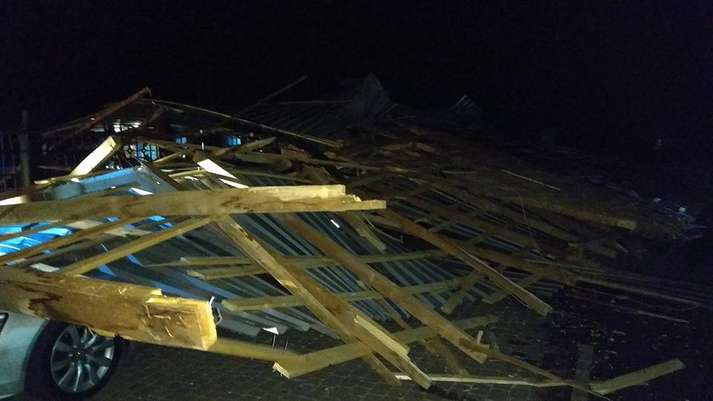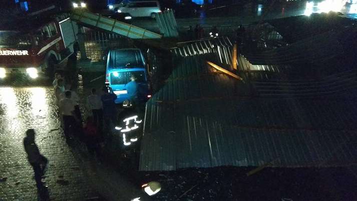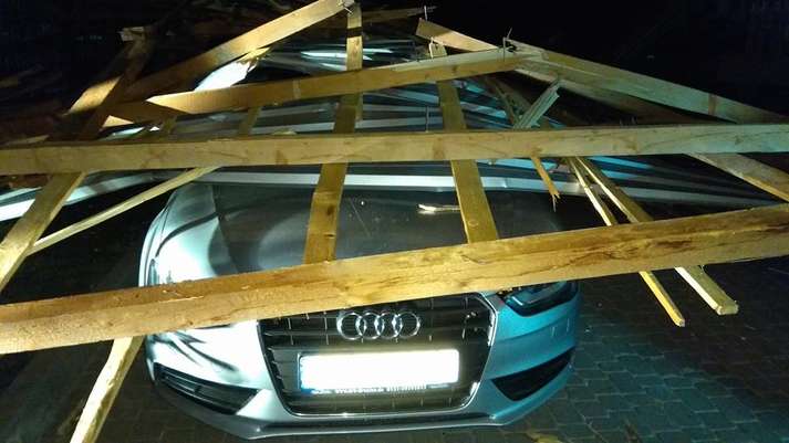 Как видно на фото, обломки крыши упали на припаркованные автомобили. В некоторых машинах были разбиты стекла.