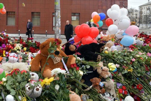 Как видно на видео Путин, выйдя из автомобиля, взял большой букет красных роз, который ему принес один из мужчин, и подошел к месту, где люди оставляли цветы, воздушные шарики и детские игрушки в знак скорби по погибшим при пожаре.