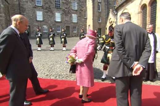 Королеву встречал почетный караул, возле которого стоял пони. Животное облюбовало цветы королевы и решило ими полакомиться, откусив пару штук. Елизавет II мгновенно отреагировала на такое нахальство и спрятала букет за спину.