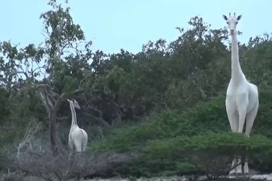 В заповедной зоне на северо-востоке Кении зоозащитники впервые сняли на видео двух жирафов редкого белого окраса.