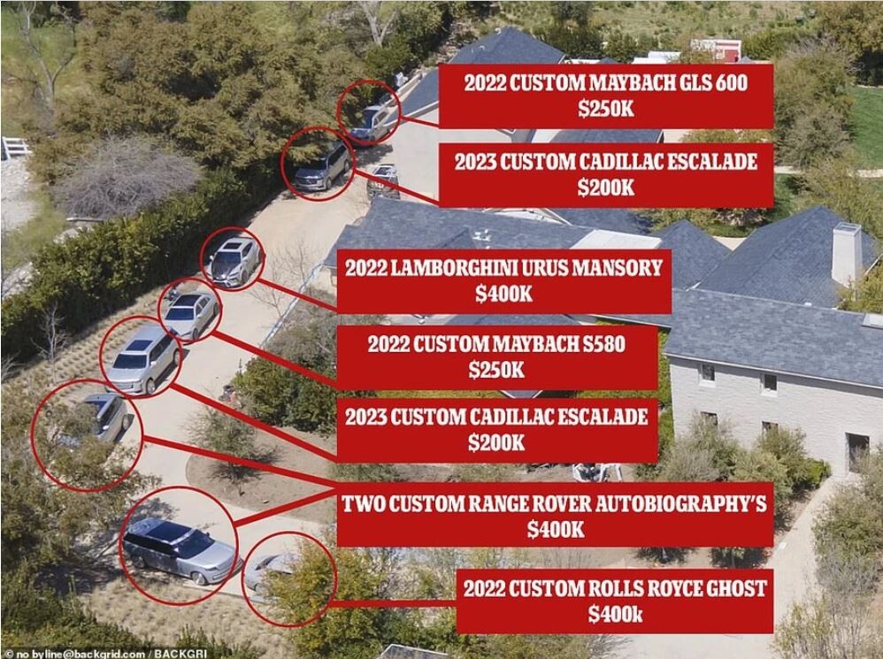 Кім безперечно подобається підбирати пару своїм автомобілям, так як деякі моделі машин виявилися абсолютно однаковими. Слідом за «майбахом» припарковано другий Cadillac Escalade 2023 року ще за 200 тисяч і два ідентичні один одному Range Rover Autobiography загальною вартістю 400 тисяч доларів. Наприкінці, напевно, однією з найдорожчих паркувань у світі стояв (знову сріблястий) Rolls-Royce Ghost 2022 року випуску вартістю 400 тисяч доларів. На останньому автомобілі, до речі, Кім їздить найрідше, хоча вона придбала його спеціально для поїздок старшого сина Сейнтана на футбольні матчі.