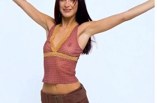 Белла приміряла всі образи, але серед них виявився предмет одягу, без перебільшення несумісний із реальним життям. Бордовий і повністю просвічуючий топ модель продемонструвала без бюстгальтера.