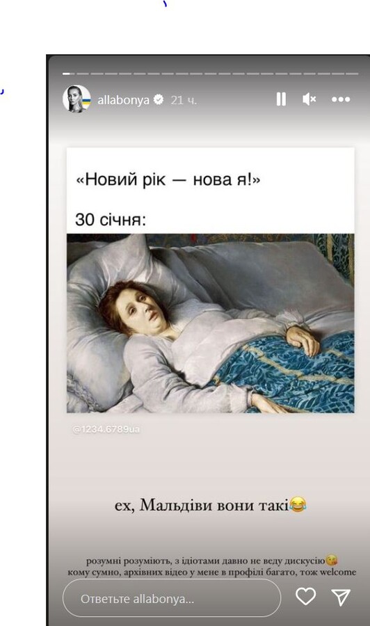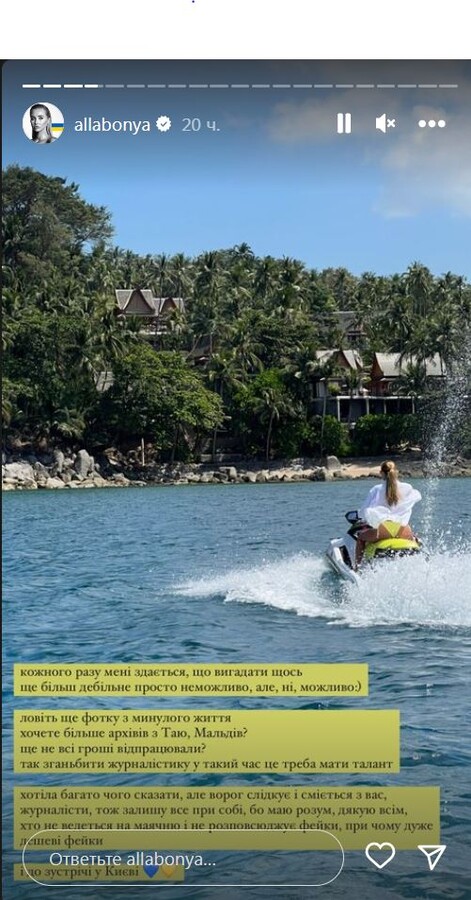 «А давайте допоможу найкращим незалежним ЗМІ. І покажу ще архівів, а то якось мало фото під ваші дешеві статті. Я вже і сама не розумію, куди мене телепортували. Так зганьбити журналістику у такий час – це треба мати талант. Хотіла багато чого сказати, але ворог слідкує і сміється з вас», – написала на одному з фото Алла.