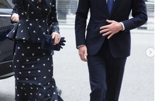 Кейт Міддлтон обрала для заходу темно-синій костюм Erdem, капелюшок Philip Treacy, туфлі-човники Gianvitto Rossi та клатч від Emmy London. Її образ доповнили розкішні прикраси – сережки з сапфірами, що колись належали принцесі Діані, та брошка з діамантами з колекції Єлизавети II.