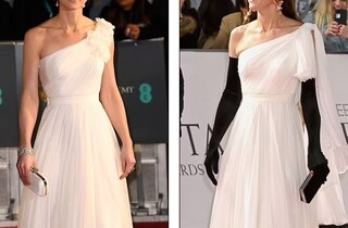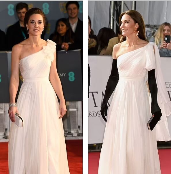 Для заходу принцеса Кетрін обрала білу сукню від бренду Alexander McQueen, яку вона вже вдягала на церемонію в 2019 році, тільки з невеликими модифікаціями. Замість блискучого декору плече прикрашав бант, а яскравим акцентом образа стали довгі оперні рукавички. Також треба звернути увагу на прикраси – це сережки ZARA вартістю 18 фунтів.