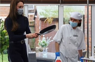 Для офіційного виходу принцеса Уельська обрала елегантну темно-синю водолазку зі штанями в тон, доповнивши образ пальта від Max&Co. У ході зустрічі Кейт стала за плиту і спробувала приготувати млинці, проте щось одразу пішло не так.