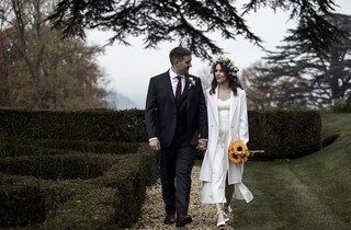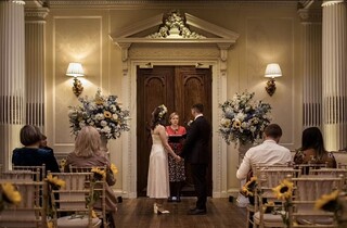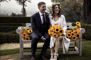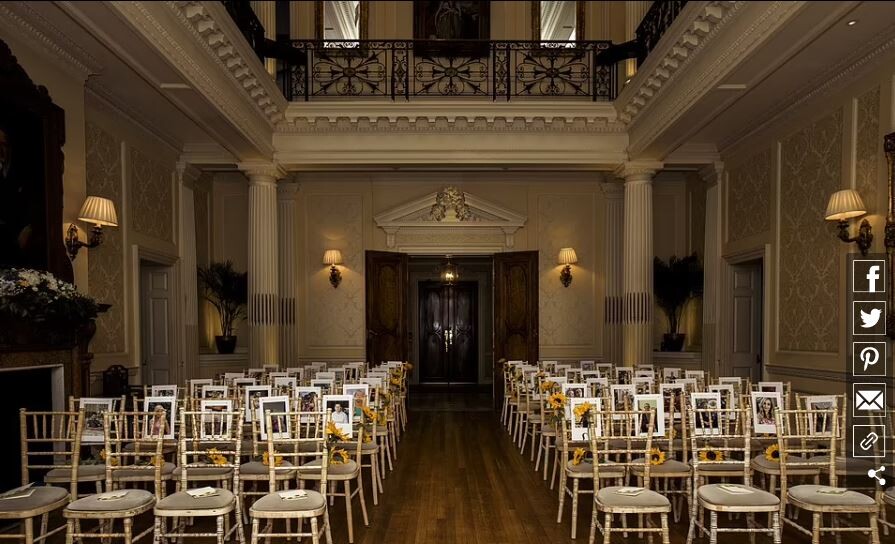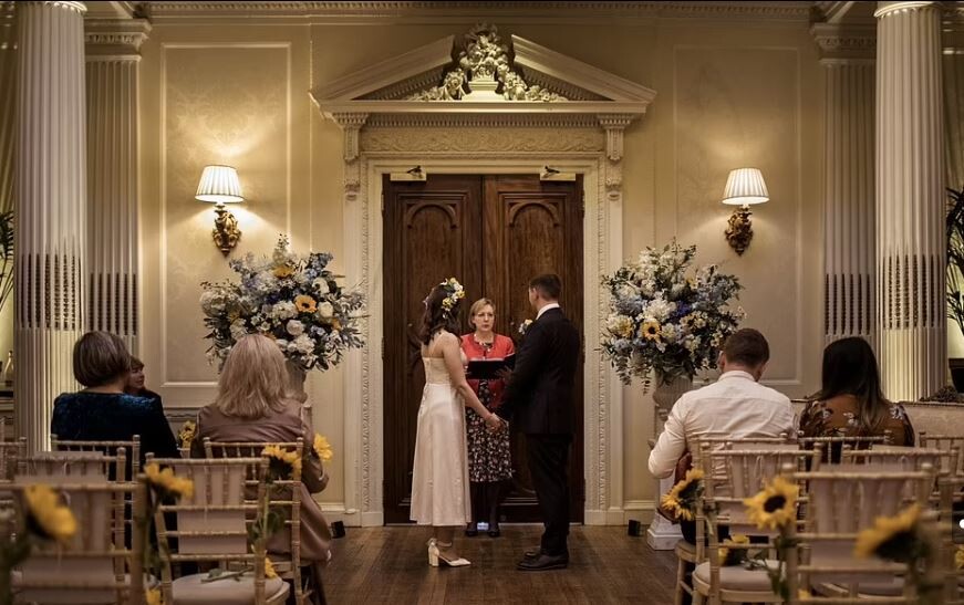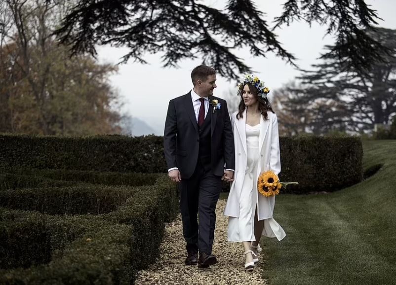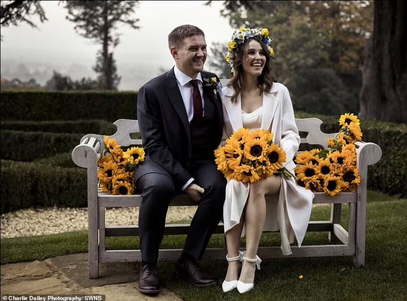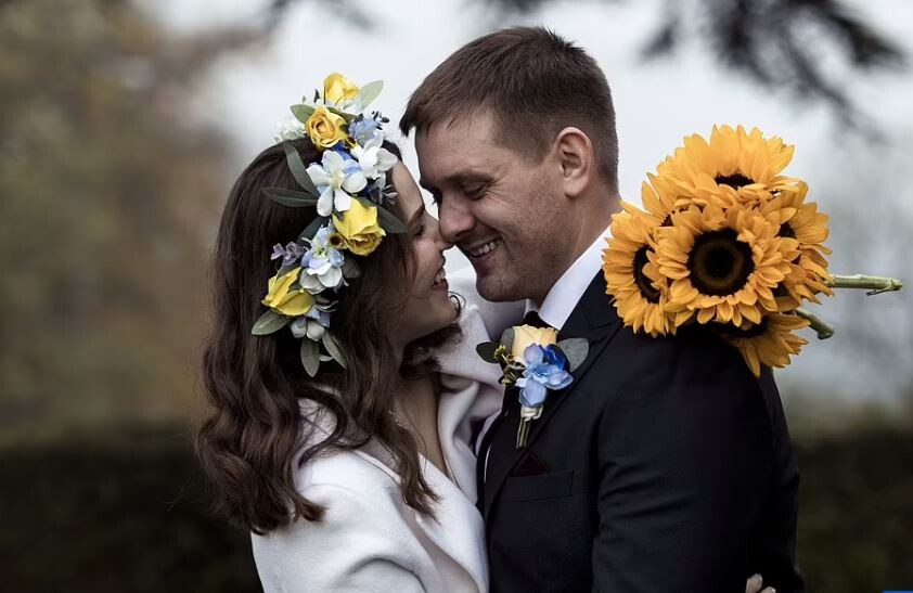 Зрештою пара оформила стосунки в оточенні кількох десятків світлих дерев'яних стільців, на яких були розташовані кольорові портрети гостей. Їх додатково прикрасили квітами. Самі наречені позували перед фотокамерами з букетами соняшників. А наречена одягла на голову вінок під колір національного прапора України. Церемонія відбулася 14 листопада у Лондоні.