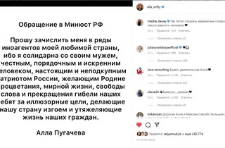Співачка Алла Пугачова опублікувала в інстаграмі «звернення до Мін'юсту РФ», в якому просить зарахувати її «до лав іноагентів». Пугачова заявила, що солідарна зі своїм чоловіком Максимом Галкіним – «чесною, порядною та щирою людиною, справжнім і непідкупним патріотом Росії», який бажає своїй країні «мирного життя, свободи слова» та припинення загибелі людей «за ілюзорні цілі».