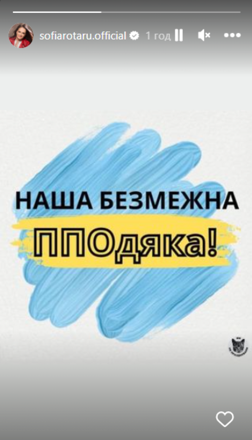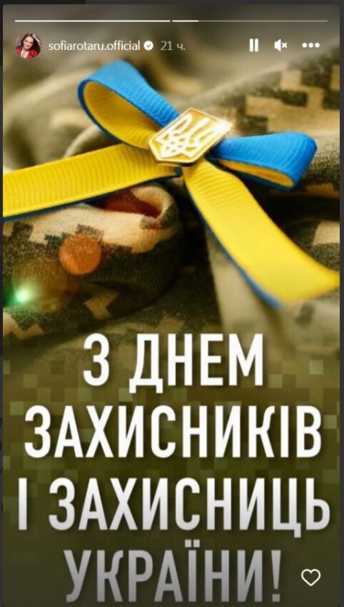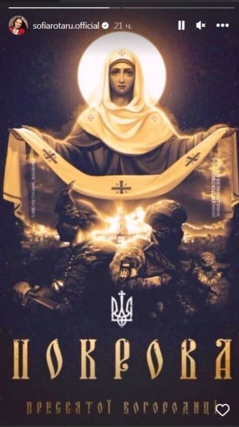 В Instagram Stories виконавиця опублікувала пост вдячності ЗСУ. На картинці, яку виклала співачка, використані кольори українського прапора: блакитного і жовтого. «Наша безмежна ППОдяка!» – написано в повідомленні. Один з останніх постів співачки був викладений 14 жовтня. Артистка опублікувала малюнок із зображенням Діви Марії, яка тримає покрив над нашими сучасними захисниками у касках, амуніції та зі зброєю в руках. До малюнку додано Герб України. Крім того, співачка розмістила в соцмережі знімок української військової форми, де зображена жовто-синя стрічка, зав’язана в бантик. «Із Днем захисників та захисниць України», – написано великими літерами на світлині.